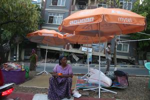 (250401) -- MANDALAY, 1 abril, 2025 (Xinhua) -- Personas se refugian en una calle, en Mandalay, Myanmar, el 1 de abril de 2025. La cifra de muertos por el devastador terremoto del pasado viernes en Myanmar ha alcanzado los 2.719, mientras que 4.521 personas resultaron heridas y otras 441 están aún desaparecidas. (Xinhua/Myo Kyaw Soe) (oa) (ah) (vf)