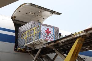 (250403) -- YANGON, 3 abril, 2025 (Xinhua) -- El segundo lote de suministros de ayuda humanitaria de emergencia enviado por el Gobierno chino llega al Aeropuerto Internacional de Yangón, en Yangón, Myanmar, el 3 de abril de 2025. (Xinhua/Jia Haocheng) (jg) (ah) (ce)