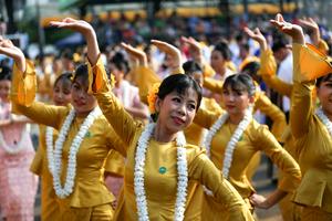 (260413) -- YANGON, 13 abril, 2026 (Xinhua) -- Bailarinas realizan una presentación durante las celebraciones del festival del agua de Thingyan, en Yangón, Myanmar, el 13 de abril de 2026. El festival, que marca el inicio del Año Nuevo de Myanmar, suele celebrarse a mediados de abril y dura de cuatro a cinco días. Este año cae el 13 de abril. (Xinhua/Myo Kyaw Soe) (oa) (ah) (vf)