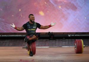 (251008) -- FORDE, 8 octubre, 2025 (Xinhua) -- Imagen del 7 de octubre de 2025 de Yeison López López, de Colombia, reaccionando durante la competencia de masculinos de 88 kg, en el Campeonato Mundial de Halterofilia de la IWF 2025, en Forde, Noruega. (Xinhua/He Canling) (ah) (ra) (ce)
