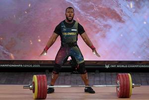 (251008) -- FORDE, 8 octubre, 2025 (Xinhua) -- Imagen del 7 de octubre de 2025 de Yeison López López, de Colombia, participando durante la competencia de masculinos de 88 kg, en el Campeonato Mundial de Halterofilia de la IWF 2025, en Forde, Noruega. (Xinhua/He Canling) (ah) (ra) (ce)