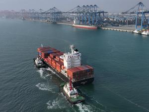 (250305) -- QINZHOU, March 5, 2025 (Xinhua) -- An aerial photo taken on March 4, 2025 shows a vessel about to dock and unload containers at Qinzhou Port in Qinzhou, south China's Guangxi Zhuang Autonomous Region. The New International Land-Sea Trade Corridor, a key logistics network connecting China's western regions to global markets, has transported 209,000 twenty-foot equivalent units (TEUs) via intermodal rail-sea service in the first two months of this year, according to the China Railway Nanning Group.