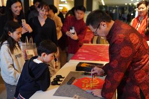 (260213) -- NUEVA YORK, 13 febrero, 2026 (Xinhua) -- Imagen del 12 de febrero de 2026 de personas observando una exposición de caligrafía china en una gala de Año Nuevo chino, en la sede de la ONU, en Nueva York. (Xinhua/Zhang Fengguo) (jg) (da) (vf)