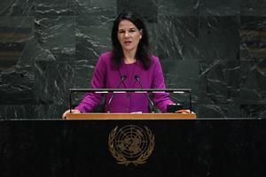 (250923) -- NACIONES UNIDAS, 23 septiembre, 2025 (Xinhua) -- La presidenta de la Asamblea General de las Naciones Unidas (AGNU), Annalena Baerbock, pronuncia un discurso en la ceremonia de apertura del debate general del 80º período de sesiones de la AGNU, en la sede de la Organización de las Naciones Unidas (ONU), en Nueva York, el 23 de septiembre de 2025. Representantes de los Estados miembros de la ONU, incluidos cerca de 150 jefes de Estado y Gobierno, se turnarán en el podio de la AGNU para pronunciar discursos sobre cuestiones mundiales durante el debate general de la AGNU que comenzó el martes. (Xinhua/Li Rui) (oa) (ah) (vf)