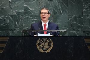 (250928) -- NACIONES UNIDAS, 28 septiembre, 2025 (Xinhua) -- Imagen del 27 de septiembre de 2025 del ministro de Relaciones Exteriores cubano, Bruno Rodríguez Parrilla, pronunciando un discurso durante el debate general del 80º período de sesiones de la Asamblea General de las Naciones Unidas, en la sede de la Organización de las Naciones Unidas, en Nueva York. (Xinhua/Li Rui) (rtg) (ah)
