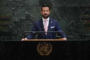 (250925) -- NACIONES UNIDAS, 25 septiembre, 2025 (Xinhua) -- El presidente montenegrino, Jakov Milatovic, pronuncia un discurso durante el debate general del 80º período de sesiones de la Asamblea General de las Naciones Unidas, en la sede de la Organización de las Naciones Unidas, en Nueva York, el 25 de septiembre de 2025. (Xinhua/Li Rui) (rtg) (ra) (ce)