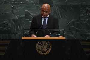(250929) -- NACIONES UNIDAS, 29 septiembre, 2025 (Xinhua) -- El representante permanente de Vanuatu ante las Naciones Unidas, Odo Tevi, pronuncia un discurso durante el debate general del 80º período de sesiones de la Asamblea General de las Naciones Unidas, en la sede de la Organización de las Naciones Unidas, en Nueva York, el 29 de septiembre de 2025. (Xinhua/Li Rui) (rtg) (ah) (vf)