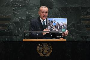 (250923) -- NACIONES UNIDAS, 23 septiembre, 2025 (Xinhua) -- El presidente turco, Recep Tayyip Erdogan, muestra una fotografía de Gaza mientras pronuncia un discurso durante el debate general del 80º período de sesiones de la Asamblea General de las Naciones Unidas, en la sede de la Organización de las Naciones Unidas, en Nueva York, el 23 de septiembre de 2025. (Xinhua/Li Rui) (oa) (ah) (ce)