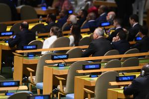 (250926) -- NACIONES UNIDAS, 26 septiembre, 2025 (Xinhua) -- Asientos vacíos del Estado de Palestina son vistos mientras el primer ministro israelí, Benjamin Netanyahu, pronuncia un discurso durante el debate general del 80º período de sesiones de la Asamblea General de las Naciones Unidas, en la sede de la ONU, en Nueva York, el 26 de septiembre de 2025. (Xinhua/Li Rui) (oa) (ra) (ce)