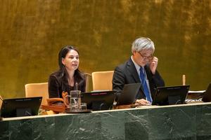 (251112) -- NACIONES UNIDAS, 12 noviembre, 2025 (Xinhua) -- Annalena Baerbock (i), presidenta de la Asamblea General de la ONU, preside una reunión de la Asamblea General para elegir a un juez de la Corte Internacional de Justicia (CIJ), en la sede de la ONU, en Nueva York, el 12 de noviembre de 2025. La jurista keniana, Phoebe Okowa, fue elegida el miércoles jueza de la CIJ para ocupar el puesto vacante dejado por Abdulqawi Yusuf de Somalia, quien renunció con efecto a partir del 30 de septiembre. (Xinhua/Evan Schneider/UN Photo) (ah) (ra) (ce)