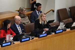 (250925) -- NACIONES UNIDAS, 25 septiembre, 2025 (Xinhua) -- La presidenta del Comité Olímpico Internacional, Kirsty Coventry (d-frente), habla durante la Cuarta Reunión de Alto Nivel de la Asamblea General de la Organización de las Naciones Unidas (ONU) sobre la prevención y el control de las enfermedades no transmisibles (ENT) y la promoción de la salud mental y el bienestar, en la sede de la ONU, en Nueva York, el 25 de septiembre de 2025. El secretario general de la ONU, António Guterres, instó el jueves a la acción global para reducir las muertes por ENT y para promover la salud mental y el bienestar. (Xinhua/Li Rui) (jg) (ah) (vf)