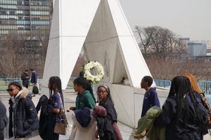 (260326) -- NACIONES UNIDAS, 26 marzo, 2026 (Xinhua) -- Imagen del 25 de marzo de 2026 de personas visitando el memorial Arte del Retorno en la sede de la ONU, en Nueva York. La Asamblea General de las Naciones Unidas aprobó el miércoles un proyecto de resolución titulado "Declaración de que la Trata de Africanos Esclavizados y la Esclavitud Racializada de Africanos como Propiedad Constituyen el Crimen más Grave contra la Humanidad". El proyecto de resolución fue aprobado con 123 votos a favor, 52 abstenciones y 3 en contra. Argentina, Israel y Estados Unidos votaron en contra. El 25 de marzo se conmemora el Día Internacional en Recuerdo de las Víctimas de la Esclavitud y la Trata Transatlántica de Esclavos. (Xinhua/Zhang Fengguo) (da) (ra) (vf)