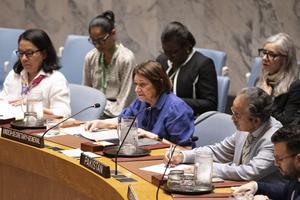 (250624) — NACIONES UNIDAS, 24 junio, 2025 (Xinhua) — La subsecretaria general de la ONU para Asuntos Políticos, Rosemary DiCarlo (c), habla en una reunión del Consejo de Seguridad sobre la no proliferación, en la sede de la ONU, en Nueva York, el 24 de junio de 2025. DiCarlo hizo un llamado el martes a la diplomacia y el diálogo para garantizar el carácter pacífico del programa nuclear de Irán. (Xinhua/Xie E) (jg) (ra) (ce)