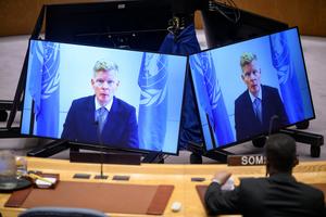 (250612) -- NACIONES UNIDAS, 12 junio, 2025 (Xinhua) -- El enviado especial de la ONU para Yemen, Hans Grundberg (en las pantallas), habla en una reunión del Consejo de Seguridad en la sede de la ONU, en Nueva York, el 12 de junio de 2025. Grundberg advirtió el jueves que la situación en el país devastado por la guerra sigue siendo frágil a pesar del acuerdo de cese al fuego en el mar Rojo entre los hutíes y Estados Unidos. (Xinhua/Loey Felipe/UN Photo) (jg) (da) (vf)