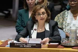 (251007) -- NACIONES UNIDAS, 7 octubre, 2025 (Xinhua) -- Imagen del 6 de octubre de 2025 de la directora ejecutiva de ONU Mujeres, Sima Bahous, hablando en una reunión del Consejo de Seguridad en la sede de la ONU, en Nueva York. Bahous hizo un llamado el lunes para renovar el compromiso global con la agenda de mujeres, paz y seguridad en vísperas del 25 aniversario de una resolución histórica que aborda las necesidades de las mujeres y las niñas en los conflictos armados. (Xinhua/Manuel Elias/ONU) (jg) (ra) (ce)