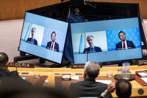 (250821) -- NACIONES UNIDAS, 21 agosto, 2025 (Xinhua) -- El enviado especial de la ONU para Siria, Geir Pedersen (i-en las pantallas), habla por videoconferencia en una reunión del Consejo de Seguridad en la sede de la ONU, en Nueva York, el 21 de agosto de 2025. Pedersen advirtió el jueves sobre el "empeoramiento del clima político" en medio de la precaria situación de seguridad en Siria. (Xinhua/Eskinder Debebe/UN Photo) (jg) (ah) (vf)