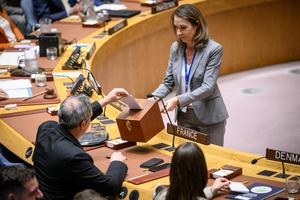 (250528) -- NACIONES UNIDAS, 28 mayo, 2025 (Xinhua) -- Imagen del 27 de mayo de 2025 de una funcionaria de conferencias recogiendo papeletas durante una reunión del Consejo de Seguridad de la ONU para elegir a un juez de la Corte Internacional de Justicia (CIJ), en la sede de la ONU, en Nueva York. El embajador de Jordania ante la ONU, Mahmoud Hmoud, fue elegido el martes juez de la CIJ para reemplazar a Nawaf Salam, quien dimitió en enero tras su nombramiento como primer ministro libanés. (Xinhua/Loey Felipe/UN Photo) (jg) (da) (ce)