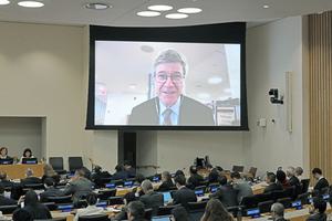 (250610) -- NACIONES UNIDAS, 10 junio, 2025 (Xinhua) -- Imagen del 9 de junio de 2025 del economista estadounidense Jeffrey Sachs (en la pantalla) hablando a través de un enlace de vídeo durante un evento de la ONU para conmemorar el primer aniversario del Día Internacional para el Diálogo entre Civilizaciones, en la sede de la ONU, en Nueva York. El destacado economista estadounidense Sachs instó el lunes a Occidente, en particular a Estados Unidos, a dialogar con el resto del mundo. (Xinhua/Li Rui) (jg) (ra) (ra) (ce)