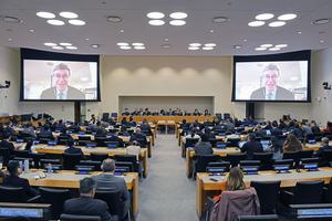 (250610) -- NACIONES UNIDAS, 10 junio, 2025 (Xinhua) -- Imagen del 9 de junio de 2025 del economista estadounidense Jeffrey Sachs (en las pantallas) hablando a través de un enlace de video durante un evento de la ONU para conmemorar el primer aniversario del Día Internacional para el Diálogo entre Civilizaciones, en la sede de la ONU, en Nueva York. El destacado economista estadounidense Sachs instó el lunes a Occidente, en particular a Estados Unidos, a dialogar con el resto del mundo. (Xinhua/Li Rui) (jg) (ra) (ra) (ce)