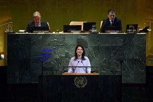 (250922) -- NACIONES UNIDAS, 22 septiembre, 2025 (Xinhua) -- La presidenta de la Asamblea General de la Organización de las Naciones Unidas (ONU), Annalena Baerbock (frente), habla durante una sesión especial de la Asamblea General de la ONU para conmemorar el 80º aniversario de la fundación de la ONU, en su sede en Nueva York, el 22 de septiembre de 2025. Líderes mundiales instaron a renovar el compromiso con el multilateralismo y los principios fundacionales de la Carta de la ONU en una sesión especial de la Asamblea General celebrada el lunes, con motivo del 80° aniversario de la organización. (Xinhua/Li Rui) (rtg) (ah) (ce)