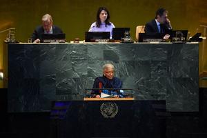 (250922) -- NACIONES UNIDAS, 22 septiembre, 2025 (Xinhua) -- La expresidenta liberiana, Ellen Johnson Sirleaf (frente), habla durante una sesión especial de la Asamblea General de la Organización de las Naciones Unidas (ONU) para conmemorar el 80º aniversario de la fundación de la ONU, en su sede en Nueva York, el 22 de septiembre de 2025. Líderes mundiales instaron a renovar el compromiso con el multilateralismo y los principios fundacionales de la Carta de la ONU en una sesión especial de la Asamblea General celebrada el lunes, con motivo del 80° aniversario de la organización. (Xinhua/Li Rui) (rtg) (ah) (ce)