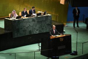 (250923) -- NACIONES UNIDAS, 23 septiembre, 2025 (Xinhua) -- Imagen del 22 de septiembre de 2025 del secretario general de la ONU, Antonio Guterres (frente), hablando durante la Conferencia Internacional de Alto Nivel para la Solución Pacífica de la Cuestión de Palestina y la Implementación de la Solución de Dos Estados, en la sede de la ONU, en Nueva York. El presidente francés, Emmanuel Macron, dijo el lunes en una reunión de la ONU sobre la solución de dos Estados que su país reconoce al Estado de Palestina, con lo que se une a la mayoría de los demás Estados miembros de la ONU que ya lo han hecho. (Xinhua/Li Rui) (oa) (ah) (ce)