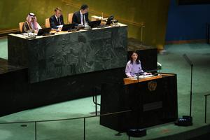 (250923) -- NACIONES UNIDAS, 23 septiembre, 2025 (Xinhua) -- Imagen del 22 de septiembre de 2025 de Annalena Baerbock (frente), presidenta del 80º período de sesiones de la Asamblea General de la ONU, hablando durante la Conferencia Internacional de Alto Nivel para la Solución Pacífica de la Cuestión de Palestina y la Implementación de la Solución de Dos Estados, en la sede de la ONU, en Nueva York. El presidente francés, Emmanuel Macron, dijo el lunes en una reunión de la ONU sobre la solución de dos Estados que su país reconoce al Estado de Palestina, con lo que se une a la mayoría de los demás Estados miembros de la ONU que ya lo han hecho. (Xinhua/Li Rui) (oa) (ah) (ce)
