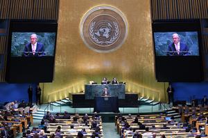 (250923) -- NACIONES UNIDAS, 23 septiembre, 2025 (Xinhua) -- Imagen del 22 de septiembre de 2025 del secretario general de la Organización de las Naciones Unidas (ONU), António Guterres, hablando durante la Reunión de Alto Nivel con motivo del 30º aniversario de la Cuarta Conferencia Mundial de la Mujer, en la sede de la ONU, en Nueva York. La Reunión de Alto Nivel con motivo del 30º aniversario de la Cuarta Conferencia Mundial de la Mujer se llevó a cabo el lunes en la sede de la ONU en Nueva York. (Xinhua/Li Rui) (jg) (ra) (ce)