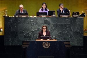 (250923) -- NACIONES UNIDAS, 23 septiembre, 2025 (Xinhua) -- Imagen del 22 de septiembre de 2025 de Sima Bahous (frente), secretaria general adjunta de la Organización de las Naciones Unidas (ONU) y directora ejecutiva de ONU Mujeres, hablando durante la Reunión de Alto Nivel con motivo del 30º aniversario de la Cuarta Conferencia Mundial de la Mujer, en la sede de la ONU, en Nueva York. La Reunión de Alto Nivel con motivo del 30º aniversario de la Cuarta Conferencia Mundial de la Mujer se llevó a cabo el lunes en la sede de la ONU en Nueva York. (Xinhua/Li Rui) (jg) (ra) (ce)