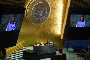(250923) -- NACIONES UNIDAS, 23 septiembre, 2025 (Xinhua) -- Imagen del 22 de septiembre de 2025 de Annalena Baerbock (frente), presidenta del 80° período de sesiones de la Asamblea General de las Naciones Unidas, hablando durante la Reunión de Alto Nivel con motivo del 30º aniversario de la Cuarta Conferencia Mundial de la Mujer, en la sede de la Organización de las Naciones Unidas (ONU), en Nueva York. La Reunión de Alto Nivel con motivo del 30º aniversario de la Cuarta Conferencia Mundial de la Mujer se llevó a cabo el lunes en la sede de la ONU en Nueva York. (Xinhua/Wu Xiaoling) (jg) (ra) (ce)