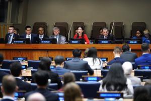 (250926) -- NACIONES UNIDAS, 26 septiembre, 2025 (Xinhua) -- Imagen del 25 de septiembre de 2025 de la presidenta de la Asamblea General de las Naciones Unidas, Annalena Baerbock (3-d-frente), hablando durante una reunión de alto nivel con motivo del 30° aniversario del Programa de Acción Mundial para los Jóvenes (WPAY, por sus siglas en inglés) en la sede de la Organización de las Naciones Unidas, en Nueva York. (Xinhua/Wu Xiaoling) (oa) (ra) (vf)