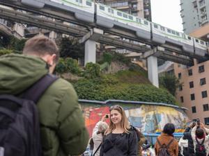 (251030) — BOGOTA, 30 octubre, 2025 (Xinhua) — Imagen del 28 de octubre de 2025 de dos hombres caminando frente a una exposición fotográfica de Xinjiang durante un evento de…