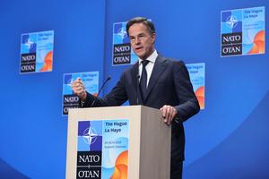 (250626) -- LA HAYA, 26 junio, 2025 (Xinhua) -- Imagen del 25 de junio de 2025 del secretario general de la Organización del Tratado del Atlántico Norte (OTAN), Mark Rutte, asistiendo a una conferencia de prensa durante la cumbre de la OTAN, en La Haya, Países Bajos. Los Estados miembros de la OTAN acordaron elevar el gasto de defensa a cinco por ciento del Producto Interno Bruto anualmente para 2035, de acuerdo con una declaración emitida el miércoles después de la cumbre de alto nivel en La Haya. (Xinhua/Zhao Dingzhe) (rtg) (ra) (vf)