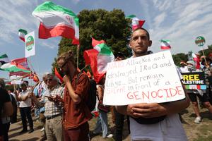 (250623) -- LA HAYA, 23 junio, 2025 (Xinhua) -- Imagen del 22 de junio de 2025 de manifestantes sosteniendo pancartas y carteles, en La Haya, Países Bajos. La manifestación, a la que asistieron cientos de personas, tuvo lugar dos días antes de la cumbre de la OTAN, en la que se espera que los Estados miembros presionen para aumentar el gasto en defensa. (Xinhua/Zhao Dingzhe) (oa) (rtg) (ce)
