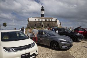 (250513) -- CIUDAD DE MEXICO, 13 mayo, 2025 (Xinhua) -- Imagen del 4 de julio de 2023 de visitantes observando vehículos eléctricos BYD, en Salvador, capital de Bahía, Brasil. A medida que continúan profundizándose los intercambios y la cooperación entre China y los países latinoamericanos, elementos chinos como restaurantes chinos, automóviles fabricados en China y trenes subterráneos construidos en China, así como diversos símbolos culturales chinos en las calles, están cobrando cada vez más presencia en la vida cotidiana de los habitantes locales, haciendo realidad la visión de profundizar las interacciones entre China y los países latinoamericanos. (Xinhua/Wang Tiancong) (jg) (ra) (vf)