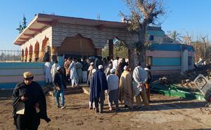 (250305) -- BANNU, 5 marzo, 2025 (Xinhua) -- Residentes se reúnen en una mezquita dañada luego de un ataque, en el distrito de Bannu de la provincia de Khyber Pakhtunkhwa, en el noroeste de Pakistán, el 5 de marzo de 2025. Doce civiles y seis terroristas murieron y 32 personas más resultaron heridas cuando los atacantes asaltaron un acuartelamiento en la provincia noroccidental paquistaní de Khyber Pakhtunkhwa (KP), según informaron fuentes policiales y funcionarios del Gobierno el martes. (Xinhua/Str) (da) (ra) (vf)