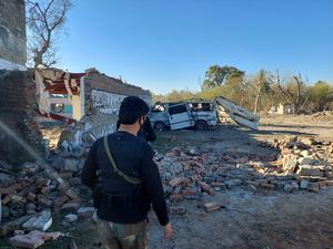 (250305) -- BANNU, 5 marzo, 2025 (Xinhua) -- Un oficial de seguridad examina el sitio de un ataque, en el distrito de Bannu de la provincia de Khyber Pakhtunkhwa, en el noroeste de Pakistán, el 5 de marzo de 2025. Doce civiles y seis terroristas murieron y 32 personas más resultaron heridas cuando los atacantes asaltaron un acuartelamiento en la provincia noroccidental paquistaní de Khyber Pakhtunkhwa (KP), según informaron fuentes policiales y funcionarios del Gobierno el martes. (Xinhua/Str) (da) (ra) (vf)
