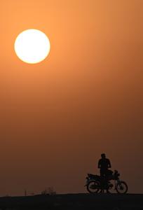 (251019) -- ISLAMABAD, 19 octubre, 2025 (Xinhua) -- Imagen del 19 de octubre de 2025 de la silueta de un hombre descansando cerca de su motocicleta durante el atardecer, en las afueras de Islamabad, capital de Pakistán. (Xinhua/Ahmad Kamal) (ah) (da)