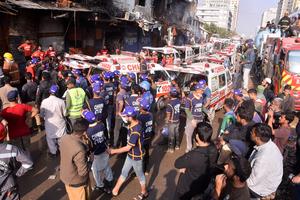 (260120) -- KARACHI, 20 enero, 2026 (Xinhua) -- Imagen del 19 de enero de 2026 de rescatistas y ambulancias vistos en el sitio de un incendio de un centro comercial, en Karachi, Pakistán. El número de muertos por un gran incendio en un edificio comercial de varios pisos en la ciudad portuaria de Karachi, en el sur de Pakistán, ascendió a 26, mientras que 74 personas siguen desaparecidas, según informaron las autoridades el martes. (Xinhua) (oa) (ah) (vf)