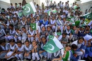 (250814) -- PAKISTAN, 14 agosto, 2025 (Xinhua) -- Estudiantes paquistaníes ondean banderas nacionales durante una ceremonia en el mausoleo del fundador de Pakistán, Muhammad Ali Jinnah, para conmemorar el Día de la Independencia del país, en la ciudad portuaria de Karachi, en el sur de Pakistán, el 14 de agosto de 2025. (Xinhua/Str) (jg) (ah) (ce)