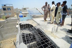 (250508) -- KARACHI, 8 mayo, 2025 (Xinhua) -- Civiles y oficiales de seguridad examinan una vivienda dañada luego de un ataque indio con drones, en Karachi, Pakistán, el 8 de mayo de 2025. Al menos un civil murió y otros cinco, incluidos cuatro militares, resultaron heridos en una serie de ataques con drones lanzados desde la madrugada del jueves por India contra múltiples puntos de Pakistán, según informó el Ejército pakistaní el jueves. (Xinhua/Str) (da) (ra) (ce)