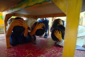 (250510) -- KARACHI, 10 mayo, 2025 (Xinhua) -- Imagen del 9 de mayo de 2025 de estudiantes paquistaníes participando en un simulacro en medio de la escalada de tensiones militares entre Pakistán e India, en la ciudad portuaria de Karachi, en el sur de Pakistán. (Xinhua/Str) (oa) (da)