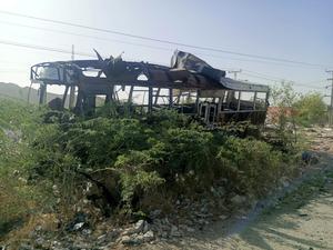 (250521) -- KHUZDAR, 21 mayo, 2025 (Xinhua) -- Imagen del 21 de mayo de 2025 del sitio del ataque terrorista a un autobús escolar, en el distrito de Khuzdar de la provincia de Baluchistán, Pakistán. Cinco personas, incluidos tres estudiantes, murieron y varias más resultaron heridas cuando terroristas atacaron el miércoles un autobús escolar en el distrito de Khuzdar, en la provincia suroccidental de Baluchistán, informó el Ejército paquistaní. (Xinhua) (ah) (ra) (ce)
