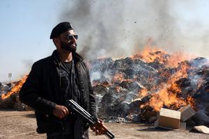 (250127) -- LAHORE, 27 enero, 2025 (Xinhua) -- Imagen del 26 de enero de 2025 de un funcionario de aduanas vigilando cerca de una pila de artículos de contrabando en llamas durante un evento para conmemorar el Día Internacional de las Aduanas, en Lahore, Pakistán. Los funcionarios de aduanas paquistaníes quemaron artículos de contrabando incautados en el país durante una ceremonia para conmemorar el Día Internacional de las Aduanas el 26 de enero. (Xinhua/Sajjad) (rtg) (ah) (vf)