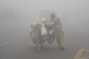 (260111) -- LAHORE, 11 enero, 2026 (Xinhua) -- Un vendedor de frutas empuja su bicicleta en medio de una densa niebla en una carretera, en Lahore, Pakistán, el 11 de enero de 2026. (Xinhua/Sajjad) (ah) (oa) (ce)