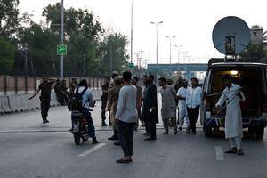 (250510) -- RAWALPINDI, 10 mayo, 2025 (Xinhua) -- Personal de seguridad detiene a personas en una carretera que conduce a la base aérea de Nur Khan tras el ataque indio con misiles, en Rawalpindi, Pakistán, el 10 de mayo de 2025.La India lanzó ataques con misiles y drones en múltiples zonas paquistaníes, incluidos tres aeródromos de la Fuerza Aérea de Pakistán, y también efectuó disparos no provocados a lo largo de la frontera internacional en la provincia oriental de Punjab, confirmaron autoridades y fuentes paquistaníes en la madrugada del sábado. (Xinhua/Ahmad Kamal) (oa) (da)
