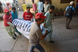 (250422) -- SINDH, 22 abril, 2025 (Xinhua) -- Rescatistas cargan el cuerpo de una víctima en un accidente de tráfico a un hospital, en el distrito de Jamshoro, en la provincia de Sindh, en el sur de Pakistán, el 22 de abril de 2025. Al menos 13 personas murieron y otras 20 resultaron heridas en un accidente de tráfico ocurrido en la provincia de Sindh, en el sur de Pakistán, confirmaron el martes las autoridades locales. El incidente tuvo lugar el lunes por la noche en el distrito de Jamshoro, donde una furgoneta de pasajeros que transportaba a más de 30 personas se salió de la carretera y se precipitó por un barranco, según fuentes de la Policía local. (Xinhua) (jg) (ra) (vf)