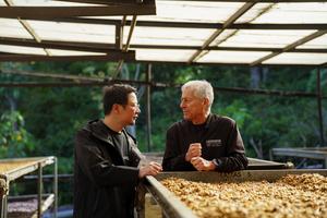 (250510) -- CHIRIQUI, 10 mayo, 2025 (Xinhua) -- Imagen del 5 de febrero de 2025 de Wilford Lamastus (d), gerente general de Lamastus Family Estates, conversando con un comprador procedente de China, en la provincia de Chiriquí, Panamá. La demanda del café Geisha panameño, reconocido por su sabor delicado con notas florales y frutales, está en auge en China, impulsada por el creciente interés de los jóvenes consumidores chinos por productos premium y experiencias sensoriales únicas, según destacaron expertos panameños a Xinhua. (Xinhua/Xu Yongzheng) (jg) (da)