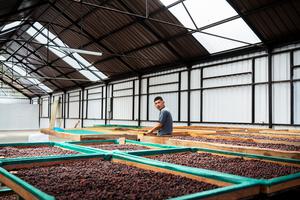 (250510) — CHIRIQUI, 10 mayo, 2025 (Xinhua) — Imagen del 3 de febrero de 2025 de un trabajador de las Fincas Kotowa removiendo granos de café, en la provincia de Chiriquí, Panamá. La demanda del café Geisha panameño, reconocido por su sabor delicado con notas florales y frutales, está en auge en China, impulsada por el creciente interés de los jóvenes consumidores chinos por productos premium y experiencias sensoriales únicas, según destacaron expertos panameños a Xinhua. (Xinhua/Xu Yongzheng) (jg) (da)