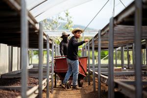 (250510) -- CHIRIQUI, 10 mayo, 2025 (Xinhua) -- Imagen del 3 de febrero de 2025 de trabajadores de Hacienda La Esmeralda transportando granos de café, en la provincia de Chiriquí, Panamá. La demanda del café Geisha panameño, reconocido por su sabor delicado con notas florales y frutales, está en auge en China, impulsada por el creciente interés de los jóvenes consumidores chinos por productos premium y experiencias sensoriales únicas, según destacaron expertos panameños a Xinhua. (Xinhua/Xu Yongzheng) (jg) (da)